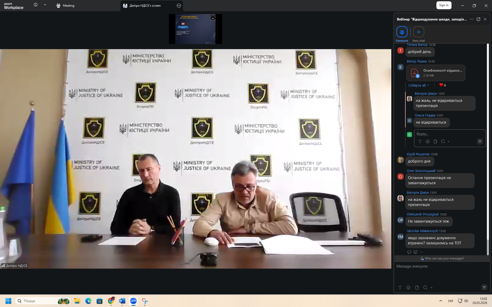 26 березня 2026 року фахівці Дніпропетровського науково-дослідного інституту судових експертиз Міністерства юстиції України взяли участь у вебінарі на тему: «Відшкодування шкоди, заподіяної РФ у процесі збройної агресії громадянам та юридичним особам в Україні». Захід був організований Національною школою суддів для суддів місцевих судів та помічників суддів місцевих і апеляційних судів.